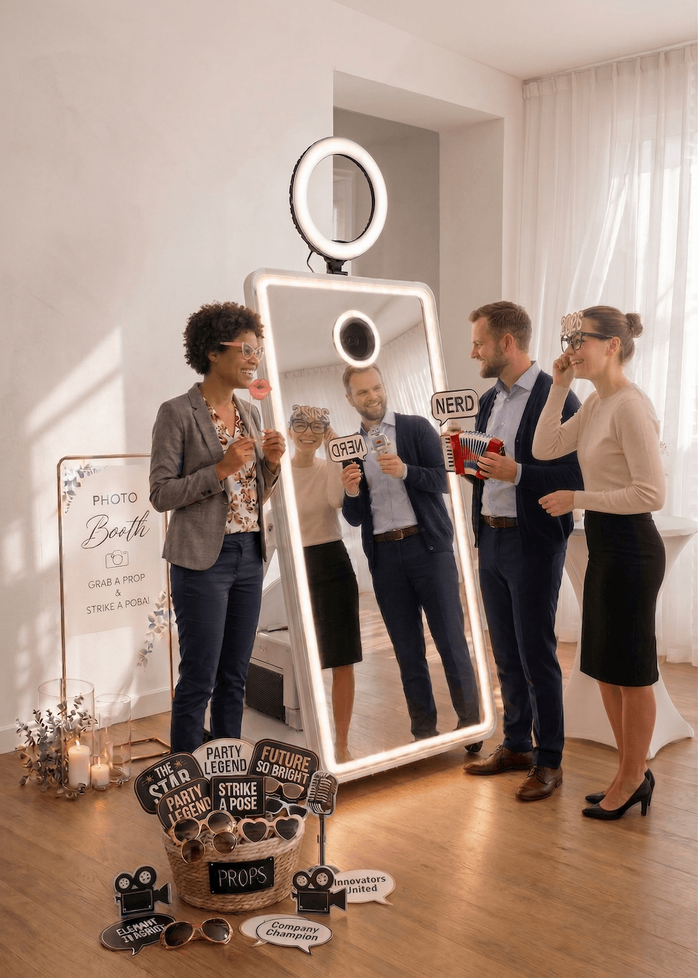 Der Fotospiegel wird zum Highlight neben der Tanzfläche. Gäste jeden Alters kommen damit zurecht, und die Erinnerungsfotos bleiben nicht nur digital, sondern landen direkt in den Händen eurer Gäste.